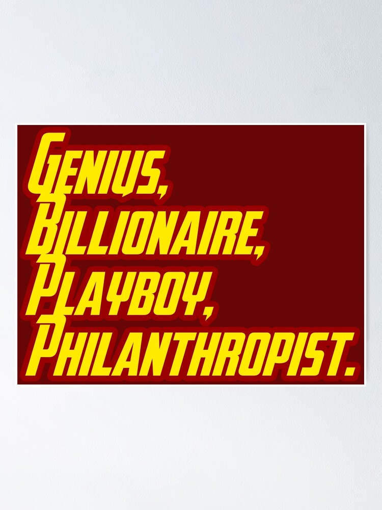 Maybe you would like to learn more about one of these? Can you identify if these people attended an ivy league college (genius), are worth over $1 billion dollars (billionaire), have appeared on the cover of playboy magazine (playboy), or are the head or founder of an established charity (philanthropist)? A genius, billionaire, playboy philanthropist. Robert downey jr.'s delivery of his genius, billionaire, playboy philanthropist line in the avengers changes between the trailer and the film. $17.95 get fast, free shipping with amazon prime & free returns.